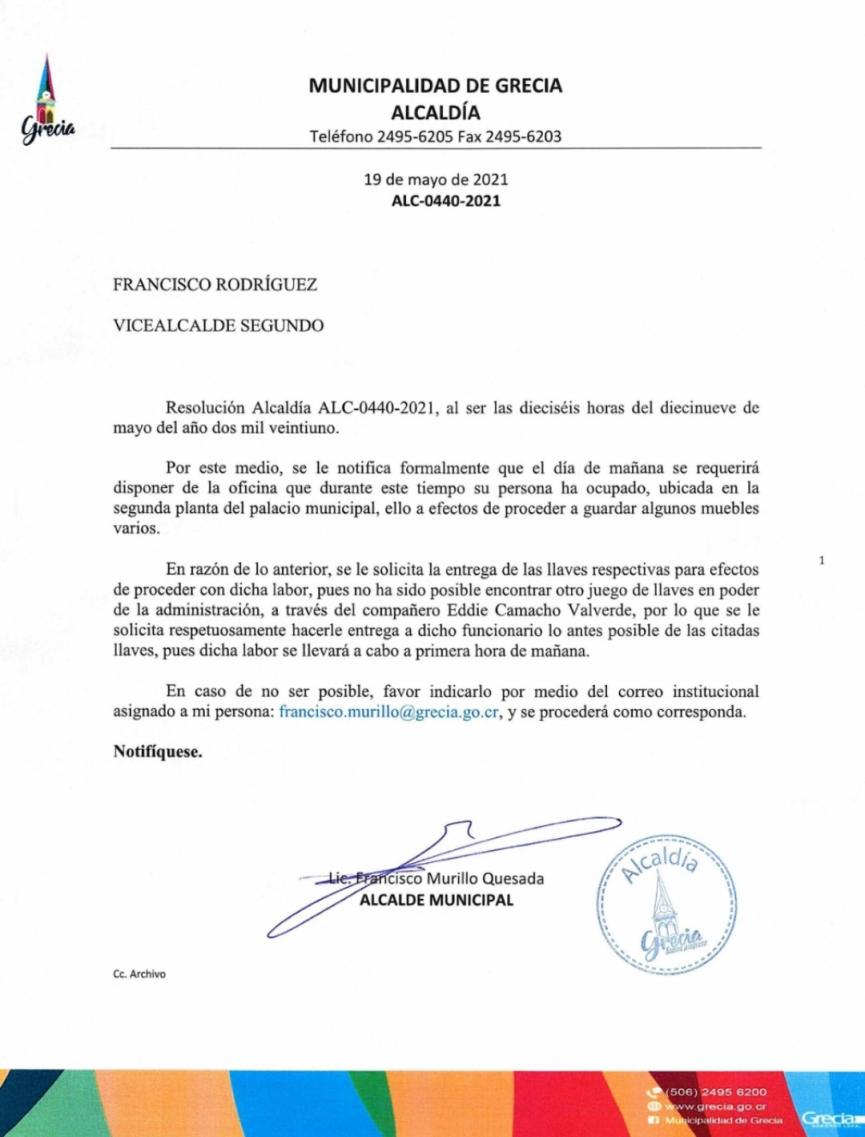 Mientras que en el oficio de la Alcaldía ALC-0440-202 se le indica a Francisco Rodríguez, segundo vicealcalde, que se requiere disponer de la oficina que ha ocupado, ubicada en la planta alta del edifico municipal para guardar algunos muebles varios, en la sesión municipal del pasado jueves, Francisco Murillo, alcalde de Grecia, salió con otro argumento.