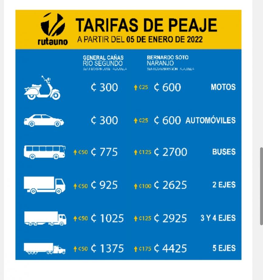 De acuerdo con los cálculos realizados por el Fideicomiso Ruta Uno, las tasas de peaje para los vehículos livianos y motocicletas que transitan por la General Cañas se mantendrán iguales; sin embargo, para las demás categorías de vehículos se percibirán variaciones entre ¢25 y ¢175 colones.