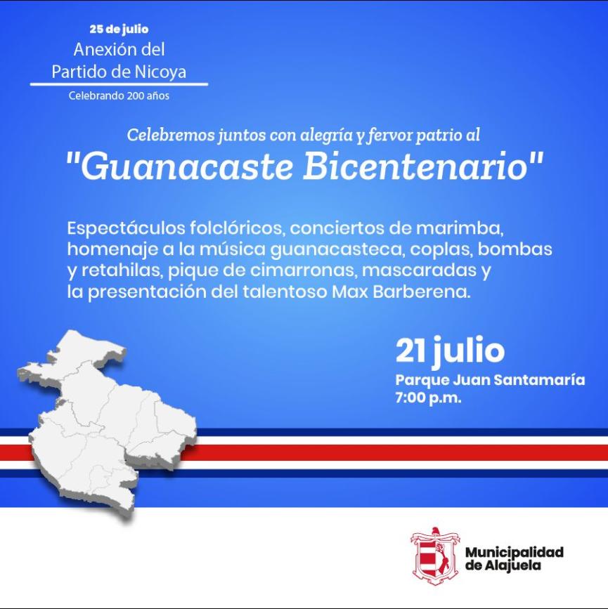 En un acto de civismo y compromiso con las raíces, Alajuela se vestirá de fiesta con profundo orgullo y fervor patriótico para unirse a la conmemoración de un aniversario más de la anexión del Partido de Nicoya a Costa Rica, este domingo 21 de julio en el Parque Juan Santamaría desde las 7:00 p.m., reafirmando así los lazos de fraternidad y solidaridad que nos definen como nación.