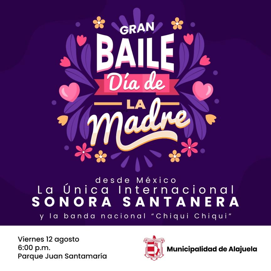 El próximo viernes 12 de agosto, a partir de las 6 p.m., en el Parque Juan Santamaría de Alajuela, el gobierno local se unirá a la celebración del día de la Madre con un grandioso baile, seguido de un show de fuegos artificiales aéreos, efectos y pirotecnia de muy bajo efecto sonoro.