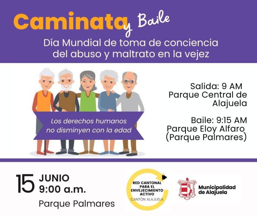 Es por esto, que se tiene programado realizar este 15 de junio a las 9 a.m. una caminata con unas 300 personas adultas mayores aproximadamente de todo el cantón, la cual saldrá del Parque Central de Alajuela, llegando hasta el Parque Palmares, donde se desarrollará un acto protocolario, donde se les brindará agua y fruta, seguido de un baile.
