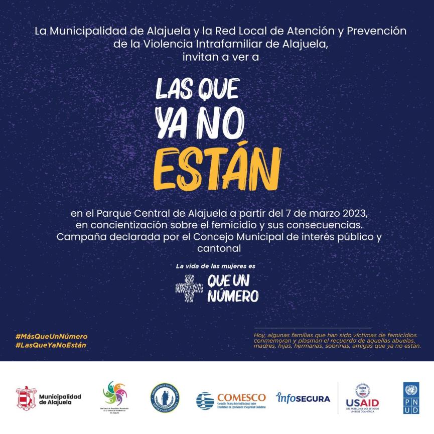 Desde este martes 7 de marzo al jueves 6 de abril de 2023, 15 siluetas de mujeres de tamaño real se podrán percibir en el parque central de Alajuela; esencialmente componen la campaña “Las que ya no están”, a la cual se ha unido el gobierno local.