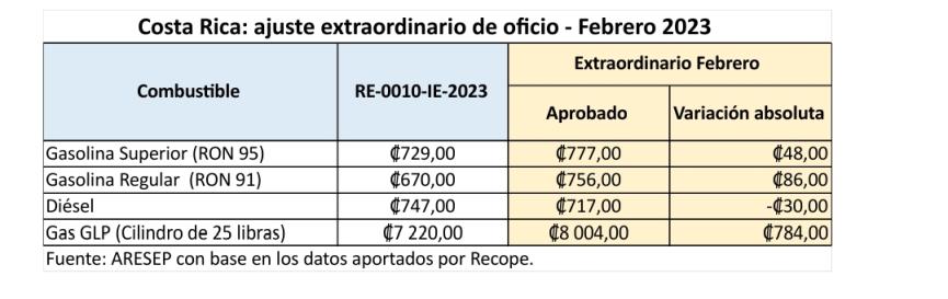 La Autoridad Reguladora de los Servicios Públicos (ARESEP) aprobó la solicitud de ajuste extraordinario de precios presentada por Recope, correspondiente al mes de febrero.