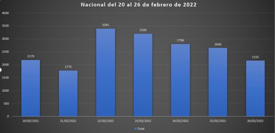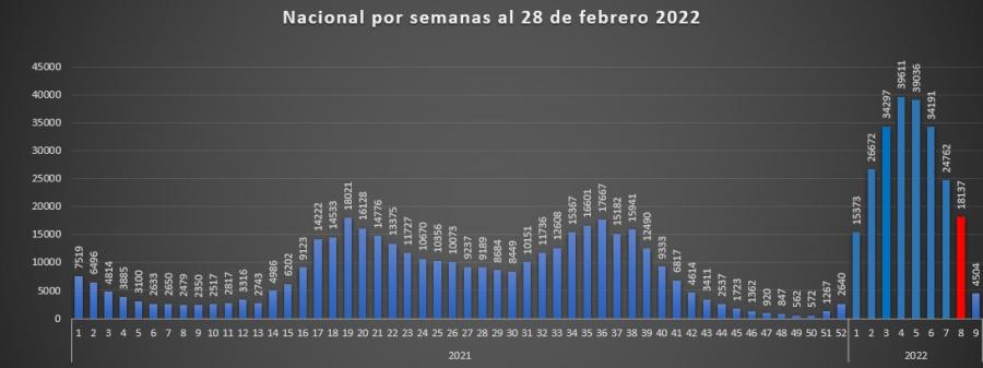Para el corte semanal se muestra una importante disminución a nivel nacional de la semana siete que fueron 24.762 y para la semana ocho con 18.137, que marca un descenso de 6.625 casos, que es alrededor del 26.75% menos de casos.