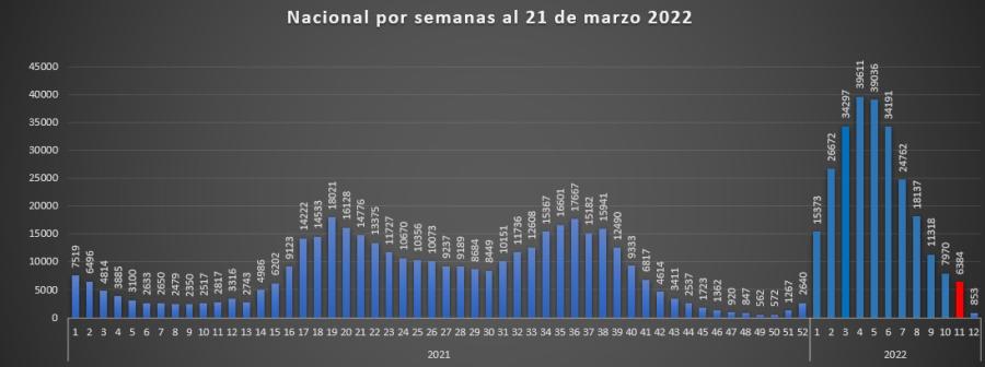Para el corte semanal se mantiene la disminución a nivel nacional de la semana diez que fueron 7.970 y para la semana once con 6.384, que marca un descenso de 1.586 casos, que es alrededor del 19.89% menos de casos.