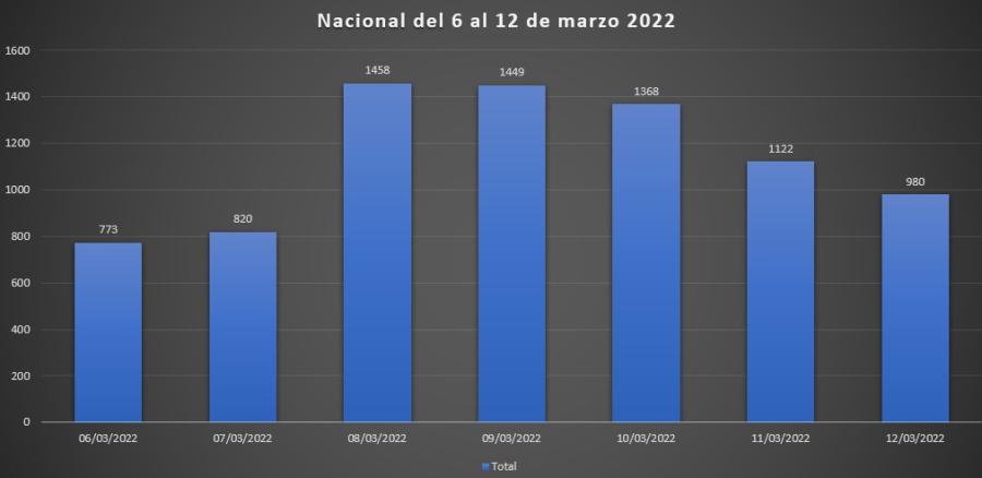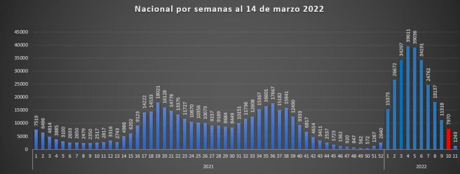 Para el corte semanal se muestra nuevamente una importante disminución a nivel nacional de la semana nueve que fueron 11.318 y para la semana diez con 7.970, que marca un descenso de 3.348 casos, que es alrededor del 29.58% menos de casos.
