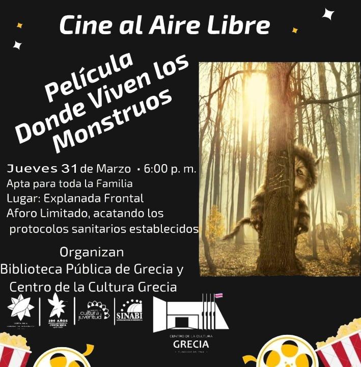 Con el objetivo de retomar las acciones de promoción cultural, artística y educativa, la Biblioteca Pública y el Centro de Cultura de Grecia; invitan a la comunidad a la actividad denominada “Cine al aire libre” que consiste en la proyección de una película de corte familiar o para todo público que derive de un libro famoso y que se pueda ver en comodidad en un espacio abierto asignado para este fin.