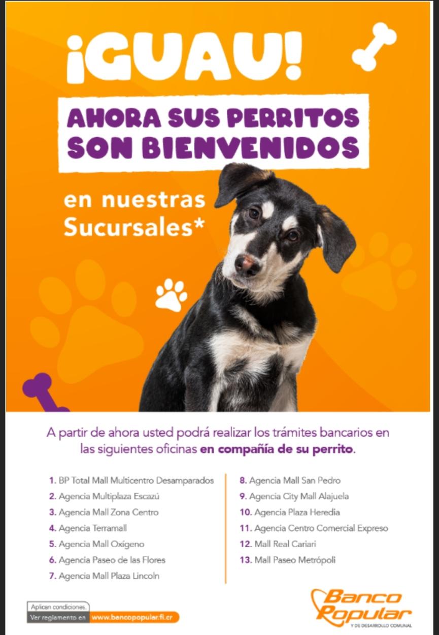 El Banco Popular informó que, a partir de este mes de diciembre 2022, trece de sus oficinas ubicas en centros comerciales del Gran Área Metropolita permitirán que sus clientes y el público en general puedan ingresar a realizar sus trámites con sus mascotas, específicamente, perros.