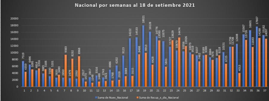El resumen para esta semana a nivel nacional, en el caso de recuperados (14097) que suman menos que los nuevos contagiados (15182), marcando este último una disminución respecto a la semana anterior de (2485) por lo que se muestra nuevamente una merma importante.