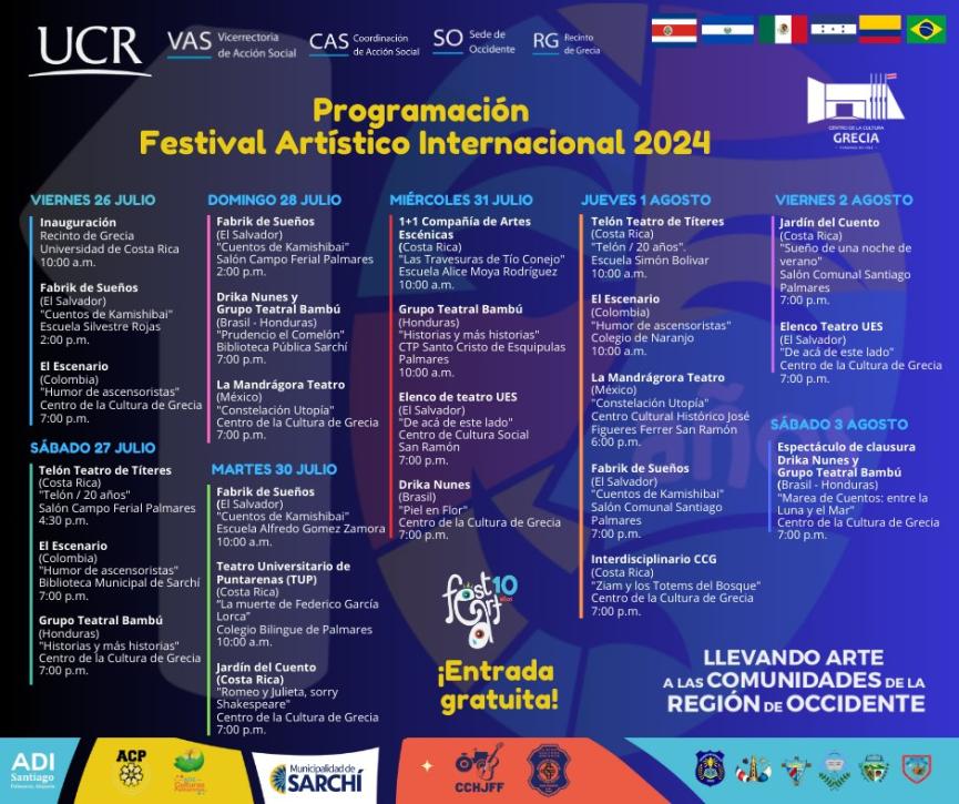 Este año el festival se realizará en los cantones de Grecia, Naranjo, Palmares, Sarchí y San Ramón, desde este viernes 26 de julio hasta el sábado 03 de agosto. Serán 22 funciones y 6 talleres.