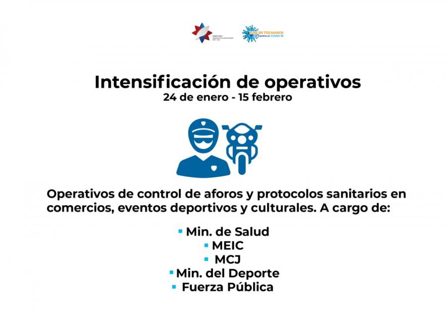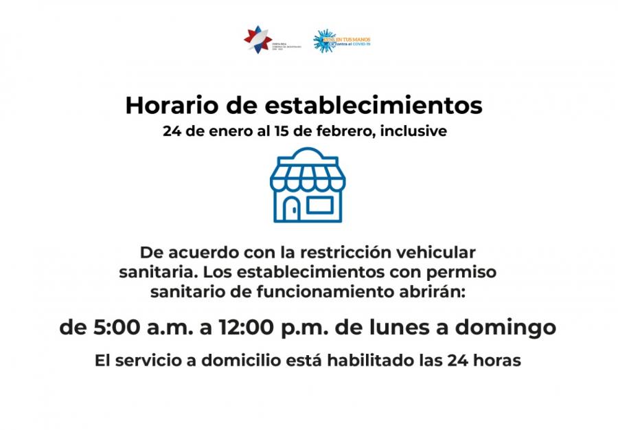 - Del 24 de enero y hasta el 15 de febrero la restricción nocturna para todo el país será de lunes a domingo de 12:00 m.n. a 5:00 a.m. y la diurna entre semana aplica únicamente al anillo de circunvalación de San José.