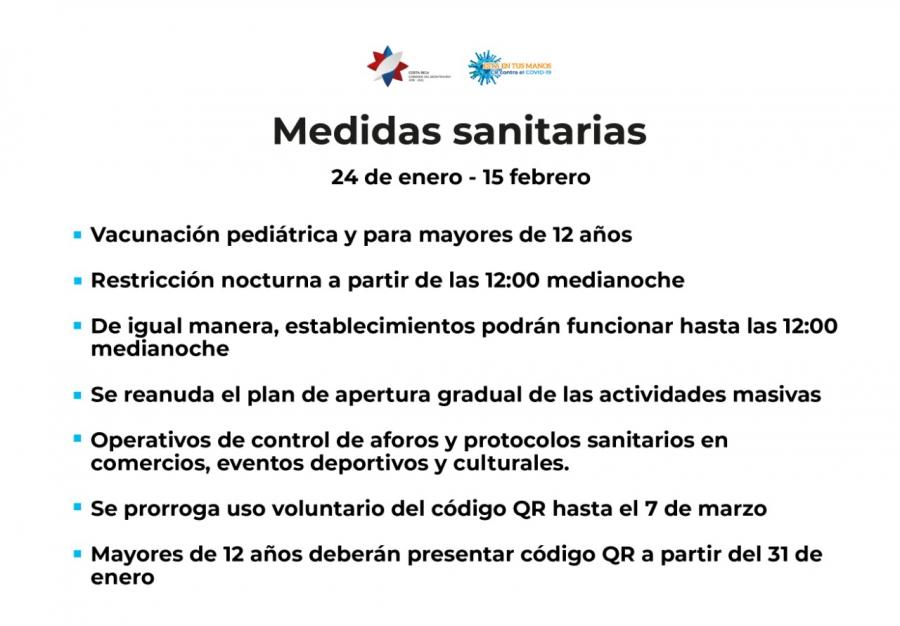 Intensificación del plan de acciones de estricta supervisión de cumplimiento de aforos y de medidas sanitarias en comercios y actividades masivas, ampliación de la restricción nocturna hasta media noche, reanudación del plan de apertura gradual de las actividades masivas, código QR para niños mayores de 12 años y personas de pie en buses son las medidas que aplicarán a partir del 24 de enero.