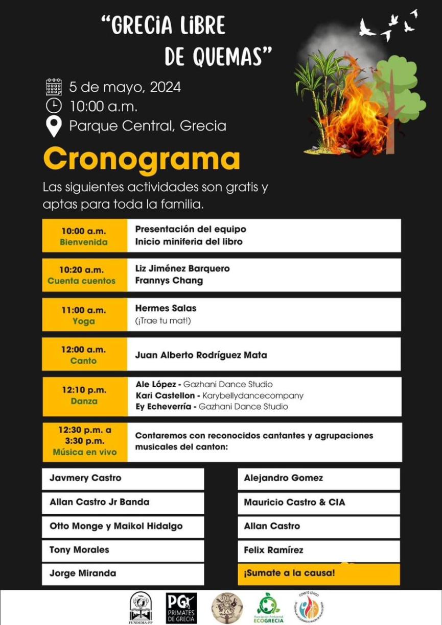 Es por eso, que el próximo domingo 5 de mayo -a partir de las 10 de la mañana, la comunidad de Grecia se unirá en un evento pacífico, sin precedentes, para expresar su rechazo a las quemas ilegales de cañales y su firme respaldo al proyecto de Ley No. 23485, el cual busca regular y controlar estas prácticas en Grecia y los cantones vecinos de la Zona de Occidente.