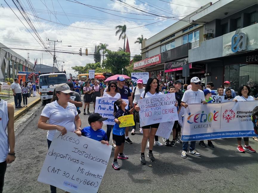 Entrenadores, atletas, padres de familia, instituciones educativas, representantes del Municipal Grecia, autoridades municipales y usuarios se manifestaron por segunda vez de forma pacífica contra el posible cierre del estadio Allen Rigioni que se podría dar el próximo 26 de junio por parte del Ministerio de Salud.