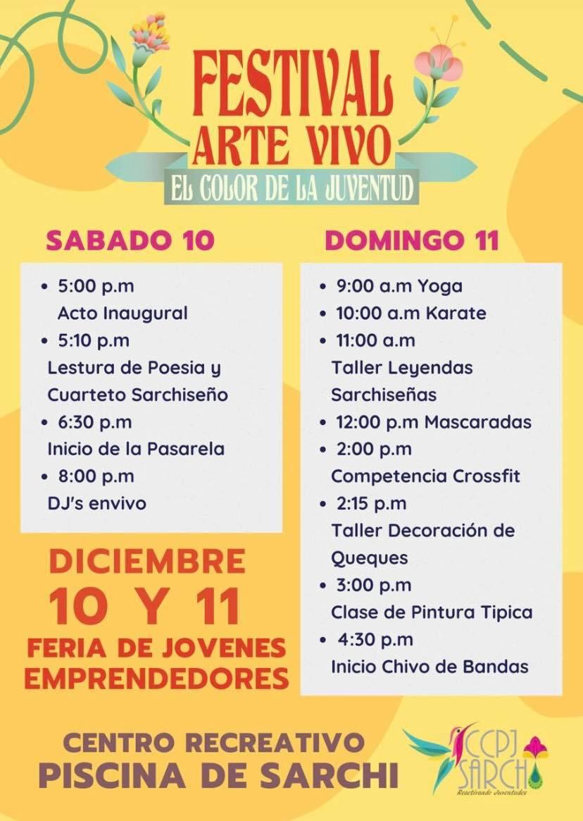 El evento es gratuito, para todas las edades y es organizado por el Comité Cantonal de la Persona Joven de Sarchí (CCPJS). Este año con una temática circense, habrá Food Trucks y espacio para hacer picnics. Se presentarán además varias bandas de música conformadas también por jóvenes sarchiseños.