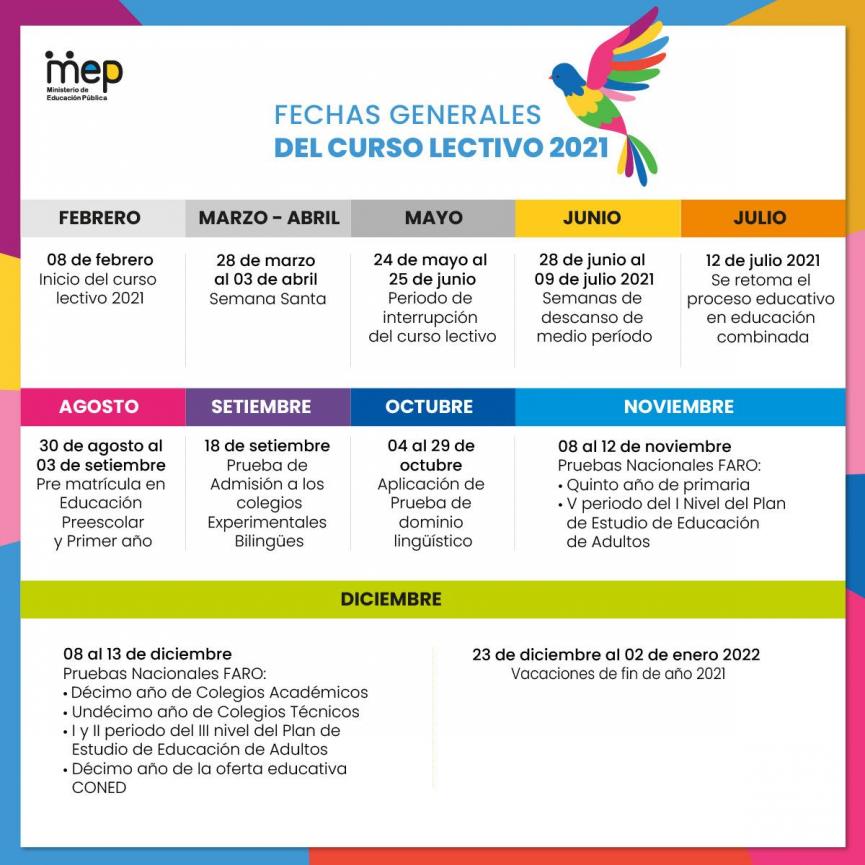 El MEP reorganizó el calendario de tal manera que se cumpla con los días lectivos al igual que todos los años. Las clases en educación combinada se retomarán el 12 de julio y hasta el 21 de enero de 2022.
