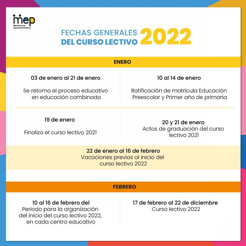 • Las graduaciones serán el 20 y 21 de enero 2022. • Del 22 de enero al 16 de febrero de 2022, habrá un nuevo tiempo de disfrute de vacaciones previas al inicio del curso lectivo 2022.