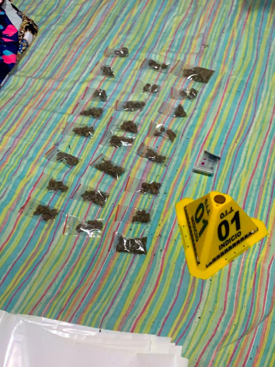 Durante el registro del inmueble se lograron ubicar y decomisar varias dosis de aparente droga tipo marihuana, así como varios implementos para el empaquetado de este psicotrópico y dinero en efectivo que se presume es producto de la venta de los estupefacientes.