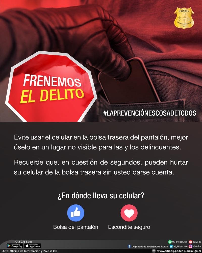 Si bien la labor del OIJ no es preventiva, como institución se vela para que las personas no sean víctimas de la delincuencia y conozcan los diferentes modos de operar, con la campaña ¨Frenemos el delito¨, se pretende que cada vez menos personas sean víctimas de estos delitos y se tome conciencia qué #LaPrevenciónEsCosaDeTodos.