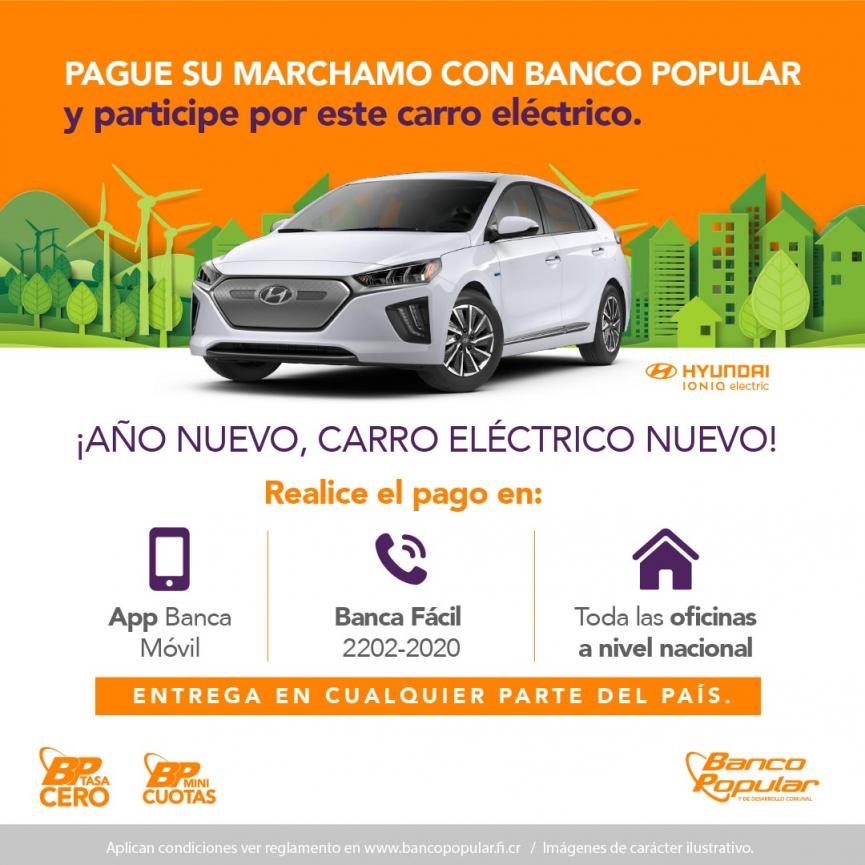 En su compromiso con incentivar mejores prácticas ambientales, a la vez de premiar la preferencia de su clientela y ciudadanía en general, el Banco Popular y de Desarrollo Comunal informó recientemente la promoción que tiene disponible este fin de año para todas las personas que realicen el pago del marchamo 2022, que consiste en el sorteo de un nuevo vehículo Hyundai IONIC 100% eléctrico.