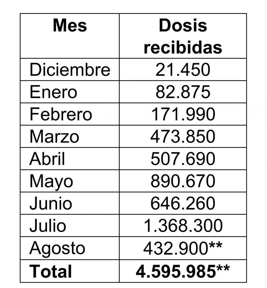 Durante lo que va de agosto, en dos entregas, se han recibido 432.900 dosis.