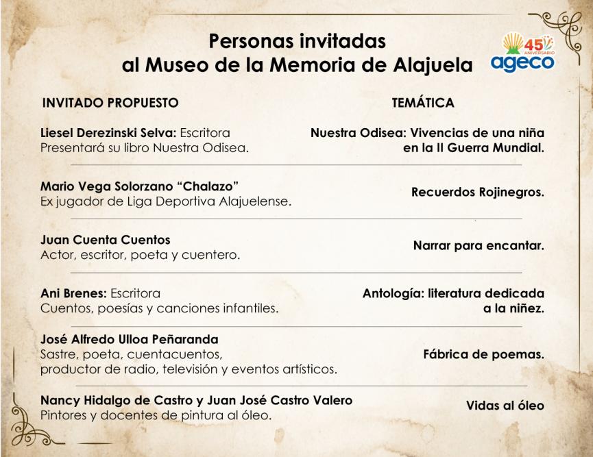 Estas son las personas invitadas que compartirán sus experiencias en el Museo de la Memoria de Alajuela: