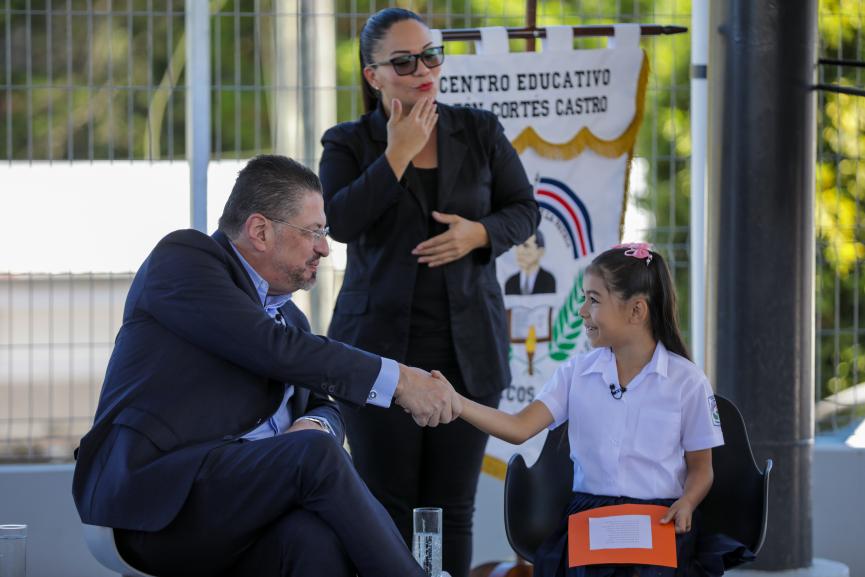 El Presidente de la República, Rodrigo Chaves Robles, asistió a la inauguración y compartió con la estudiante Noelia Sánchez Castillo, de segundo grado, quién declamó al mandatario una poesía escrita por su tío, el escritor Gustavo Castillo Durán.