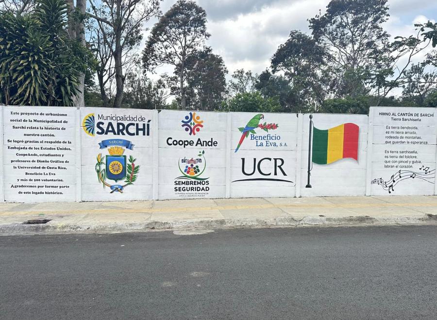 “Sarchí un Museo al Aire Libre”, es el nombre del mural más extenso de Costa Rica que se inauguró el pasado sábado con la presencia de autoridades municipales, así como representantes de CoopeAnde, la Embajada de los Estados Unidos, Beneficio la Eva y estudiantes de diseño de la UCR, quienes fueron fundamentales para realizar el proyecto.