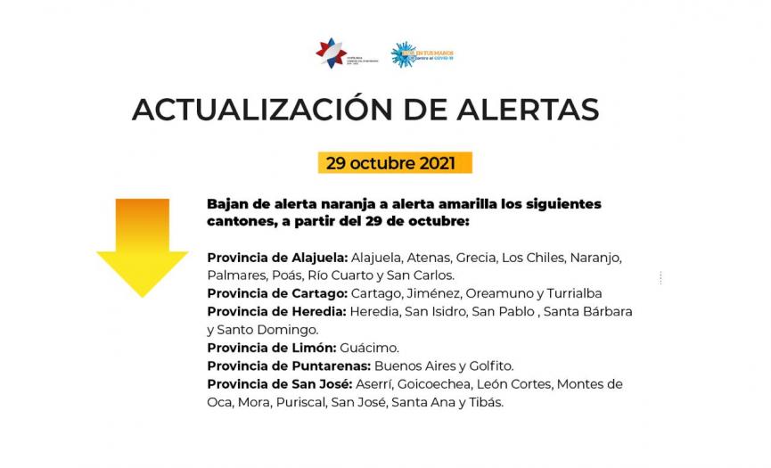 A partir mañana 29 de octubre, 30 cantones de todo el país excepto de la provincia de Guanacaste, bajarán a alerta amarilla, luego de 23 semanas de mantenerse en alerta naranja, debido a una reducción importante en la generación de casos nuevos por COVID-19 en las últimas semanas epidemiológicas, esto según datos de la Sala de Análisis de Situación Nacional.