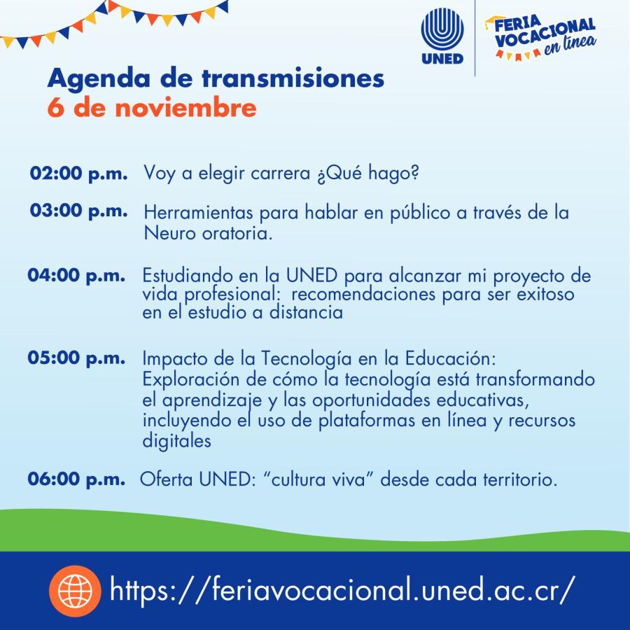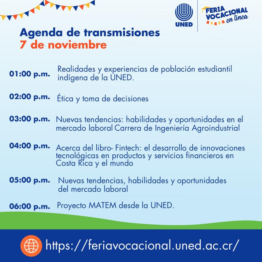 Como parte de las actividades, las personas interesadas en cursar estudios en la UNED podrán participar de un espacio para consultas del 6 al 8 de noviembre con una persona profesional en Orientación. Los horarios de atención están programados de 1:00 p.m. a 7:00 p.m. en la sala de TEAMS: ASESORÍA VOCACIONAL