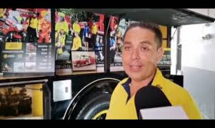 Ronny Rodríguez, capitán de la estación de Bomberos de Grecia y Douglas Granados encargado de la gira de la ruta preventiva 155 se refiere a la exhibición del Camión Oficial de la Ruta.