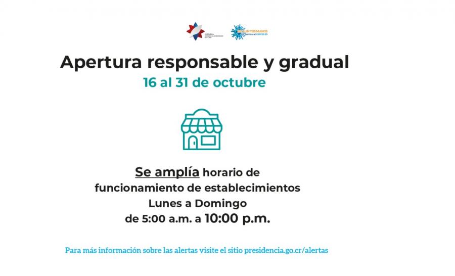 - A partir del 16 y hasta el 31 de octubre la restricción vehicular sanitaria será de 10 p.m. a 5 a.m. de lunes a domingo y los establecimientos podrán operar hasta igual hora.