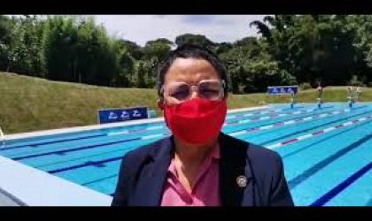 Karla Alemán, ministra del Deporte, Heibel Rodríguez, alcalde de Poás y Angie Morales, presidenta del Comité Cantonal de Deportes se refieren a la inauguración de la piscina semiolímpica.