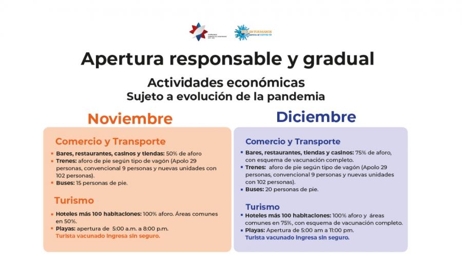 Con el objetivo de generar una mayor reactivación económica en el país, el Gobierno realizará una flexibilización responsable y gradual en las restricciones sanitarias para los últimos meses de este 2021 con una ampliación de la circulación vehicular, ampliación de aforos, especialmente para personas con esquema de vacunación completo, y permiso para el desarrollo de más actividades.