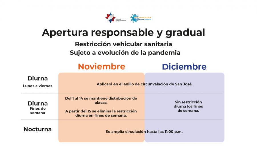 - Si la evolución de la pandemia lo permite, durante noviembre la restricción vehicular sanitaria será a partir de las 11 p.m. y se eliminaría la restricción diurna en todo el país, con excepción del anillo de circunvalación.
