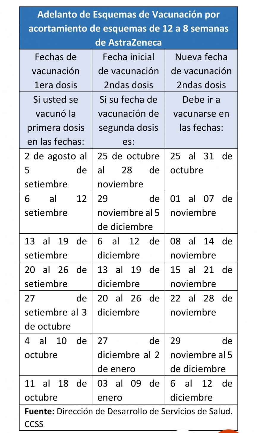 Por su parte, la gerencia médica de la Caja Costarricense de Seguro Social (CCSS) hizo de conocimiento el oficio MS-CNVE-0784-2021 a los establecimientos de salud y solicitó se realicen los ajustes de planificación para cumplir con el esquema adelantado de AstraZeneca.