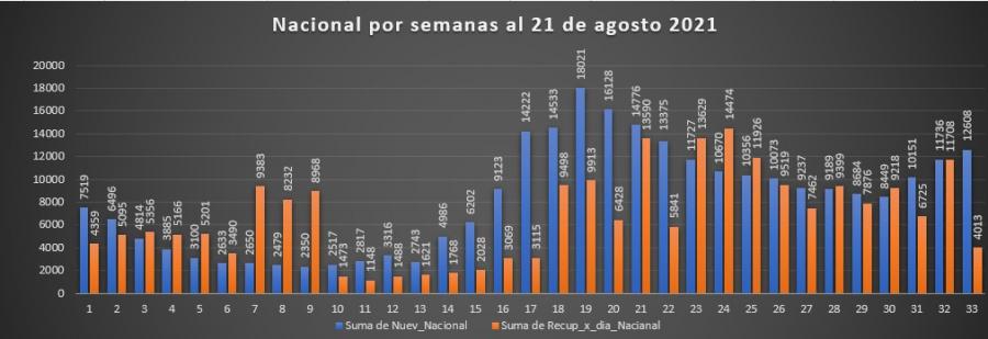 El resumen para esta semana a nivel nacional, en el caso de recuperados (4013) que suman menos que los nuevos contagiados (12608), marcando este último un aumento respecto a la semana anterior de (1872) por lo que se muestra nuevamente un incremento importante.