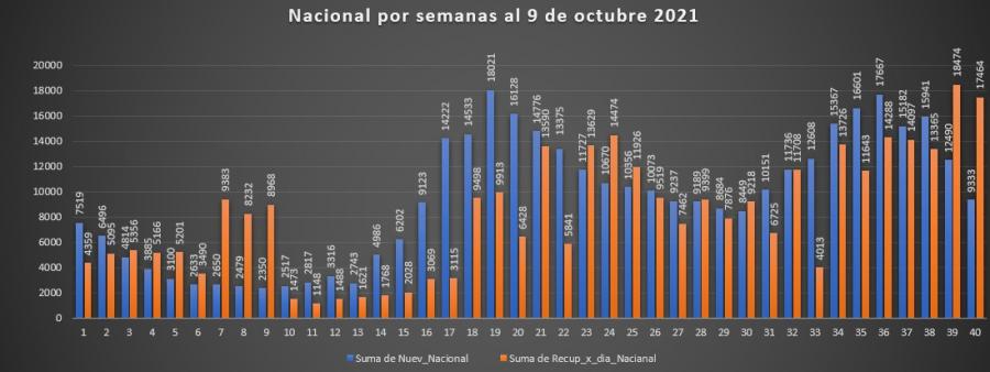El resumen para esta semana a nivel nacional, en el caso de recuperados (17464) que suman más que los nuevos contagiados (9333), marcando este una merma respecto a la semana anterior de (3157) casos, por lo que se muestra una disminución importante.