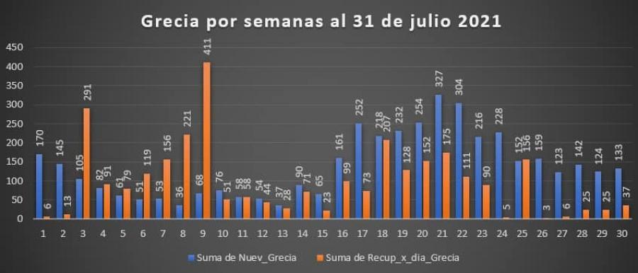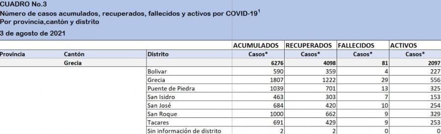 En general a nivel nacional se muestra una tendencia a la baja pero muy leve aun promediando todavía mas de 1000 y el cantón de Grecia se mantiene estancado en casos en aumento y disminución muy proporcionales de una semana a la otra. Esperamos que siga la vacunación para ver un mejor efecto y que la variante Delta no nos afecte tanto según se apliquen más dosis.