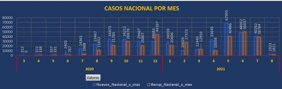 Para esta semana, nos encontramos que los casos nuevos por día a nivel nacional son 1207 en promedio y con una disminución en total respecto a la semana 29, y un promedio de recuperados de aproximadamente 1316 diarios con un aumento en este último renglón. El resumen para esta semana a nivel nacional, en el caso de recuperados (9218) que suman más que los nuevos contagiados (8449), marcando este último una disminución respecto a la semana 29.