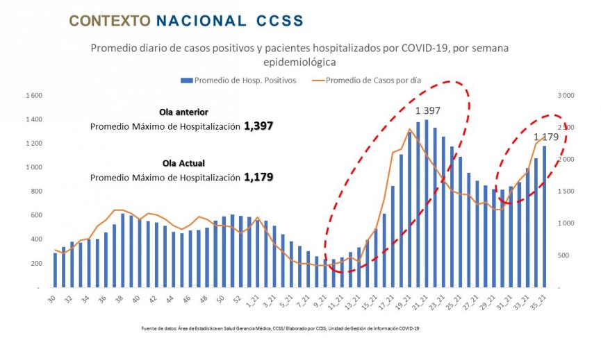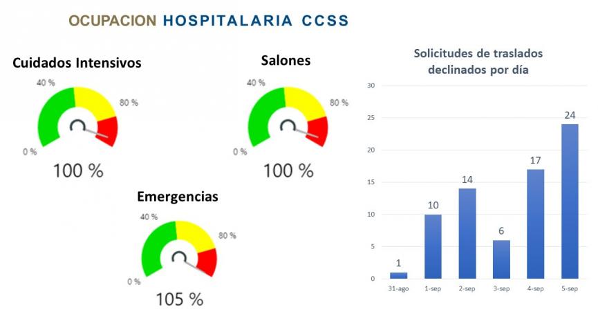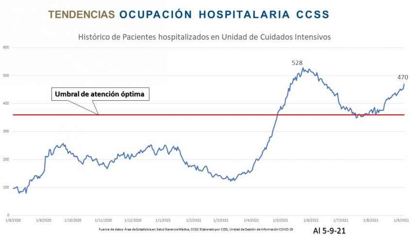 En julio la CCSS advirtió que cualquier ligero incremento en la transmisión de la enfermedad que lleve a un aumento en el número de casos generaría un repunte en la hospitalización y en los requerimientos de cuidados intensivos para el mes de setiembre y que podría incluso superar los niveles más críticos vividos en los meses de mayo y junio.