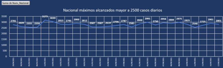 Para esta semana, nos encontramos que los casos nuevos por día a nivel nacional son 2168 en promedio y la semana anterior de 2523, mostrando nuevamente una disminución de 355 casos, y un promedio de recuperados de aproximadamente 2013 diarios, con una disminución en este último renglón.