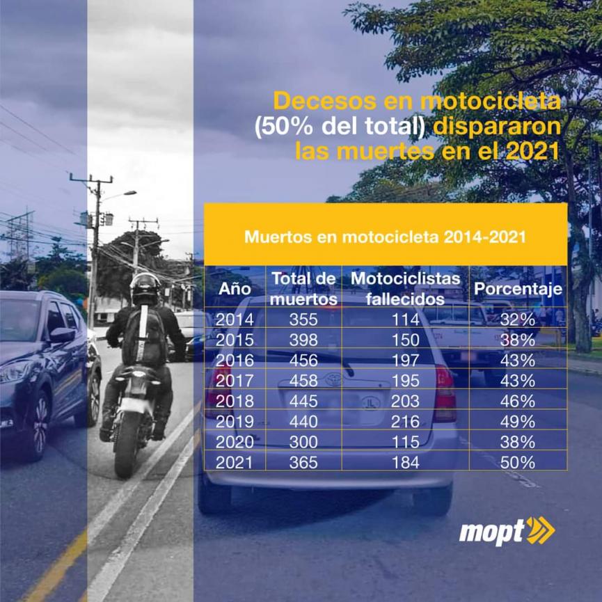 Esta particularidad se hace más notoria cuando se analizan los tres vehículos que más vidas cobraron en carretera; la motocicleta pasó de 115 fatalidades registradas en el 2020 a 184, es decir, un incremento del 60%. Esta es la primera vez que más de la mitad de los decesos en carretera corresponden a un único vehículo, a la motocicleta.