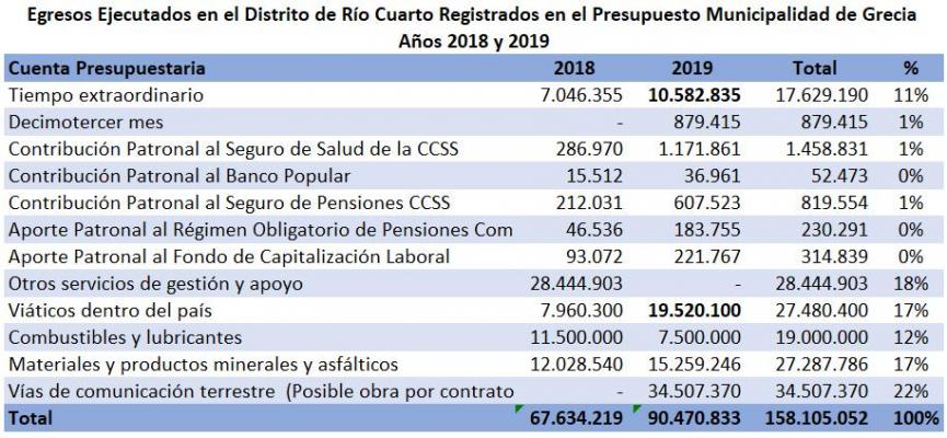 - Gastos en Río Cuarto descritos en la información enviada a la Contraloría General de la República. Por supuesto no tengo información de los contratos de cualquier tipo en materia de caminos del cantón de Río Cuarto o del resto de Grecia de los años 2018 y 2019 pero por lo menos en la parte descrita en los presupuestos, si puedo, basado en la tabla incluida en este punto, comentar lo siguiente: