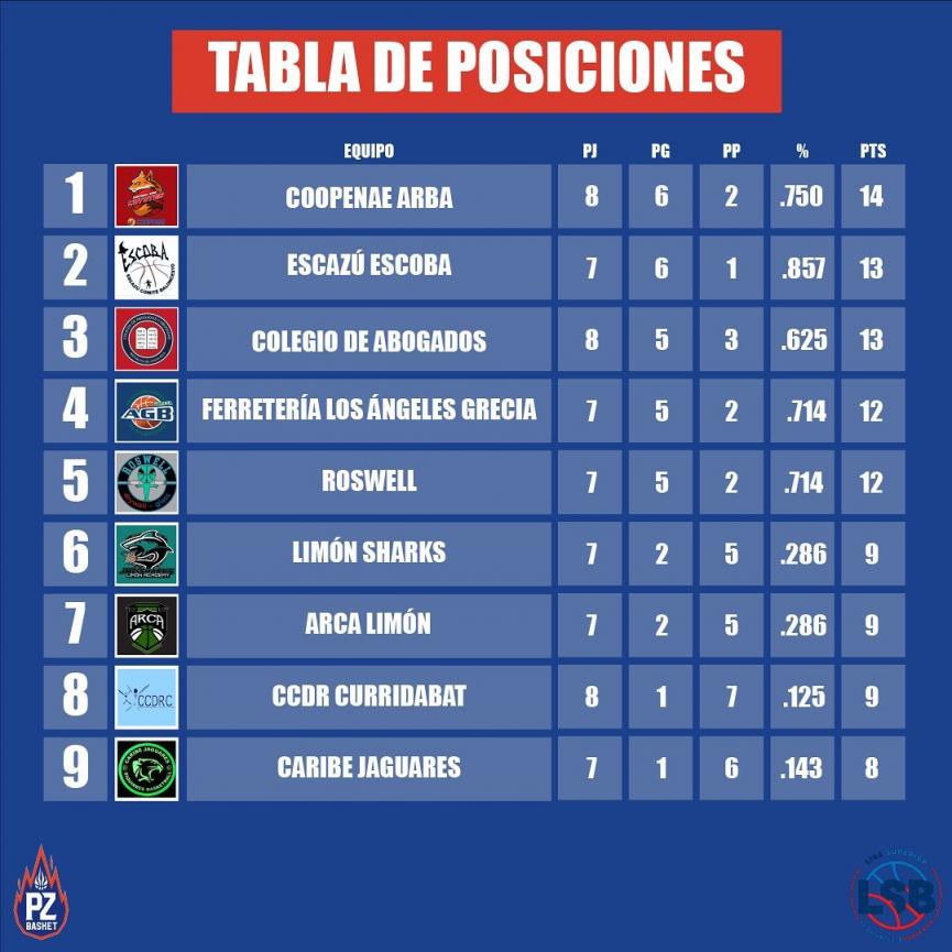 Grecia al finalizar la primera vuelta se ubica en el cuarto lugar con 12 puntos, tras cinco victorias y dos derrotas, falta por jugarse el partido ante Limón Arca que debió posponerse.