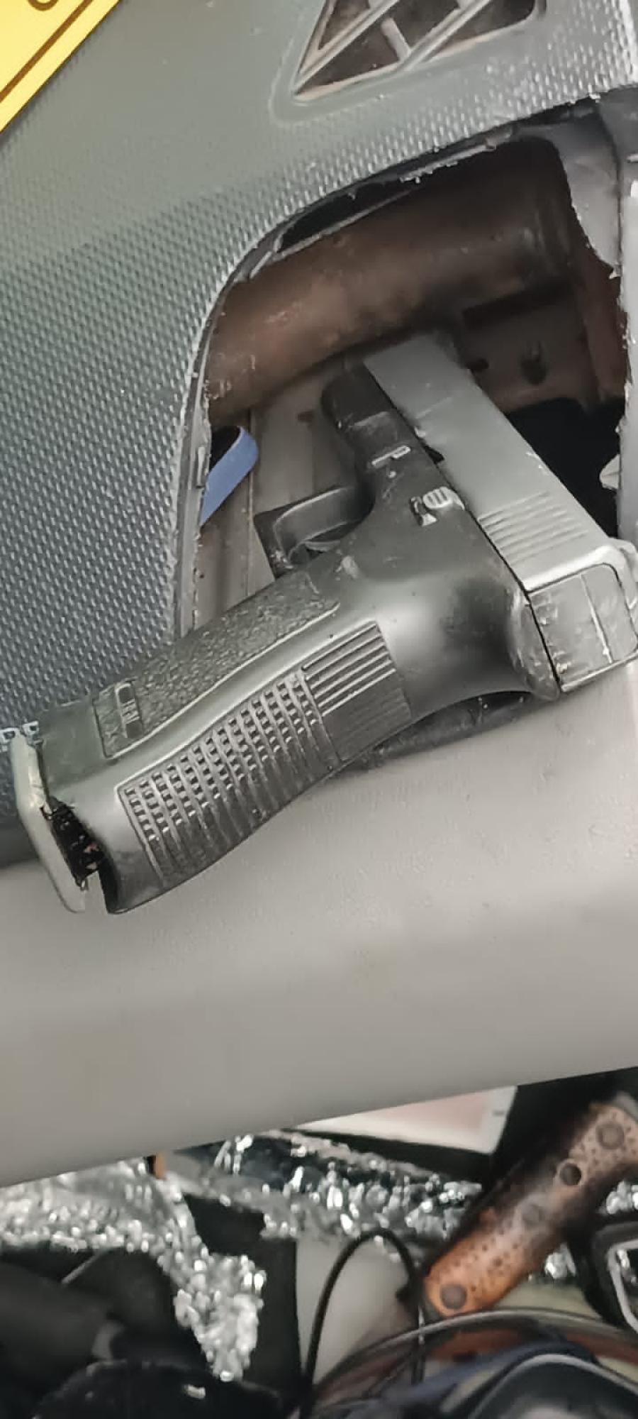 La Fuerza Pública coordinó con la fiscalía y el Organismo de Investigación Judicial (OIJ), precisamente, agentes judiciales llegaron al sitio y ubicaron en un compartimiento oculto del carro un arma de fuego, con la que se supone cometió el atraco.