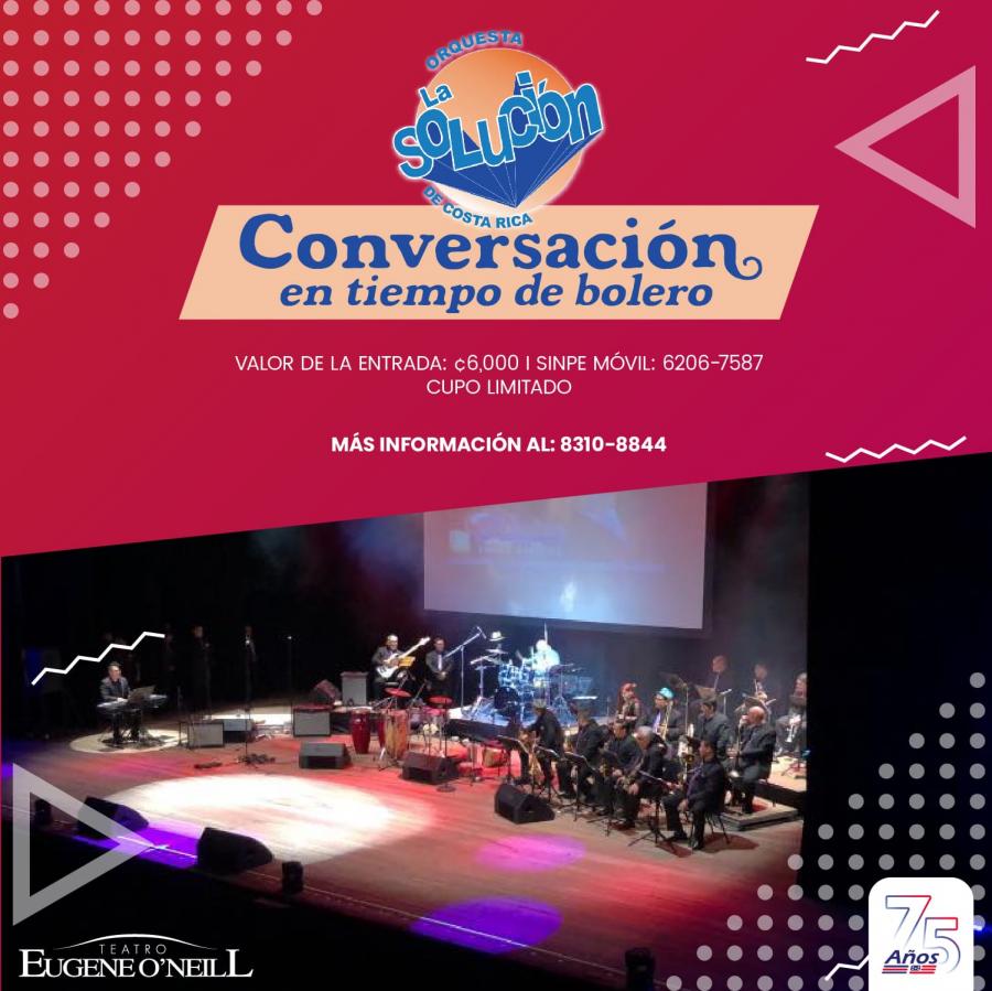 Lo mejor de bolero latinoamericano se podrá disfrutar con la música y voces de la reconocida Orquesta La Solución en el espectáculo, “Conversación en tiempo de bolero”, que regresa en dos funciones al Teatro Eugene O´Neill del Centro Cultural Costarricense Norteamericano (CCCN).