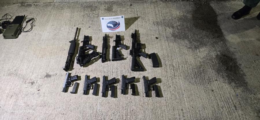 La noche de ayer miércoles, como parte de los controles que mantiene la Policía de Fronteras en el puesto policial del kilómetro 35 en Guaycará de Golfito, zona sur del país, se intervino un vehículo en el cual los oficiales descubrieron, gracias a su experticia y con la ayuda de un agente canino, un compartimiento oculto en el que fue hallado un importante arsenal que fue decomisado por la policía.