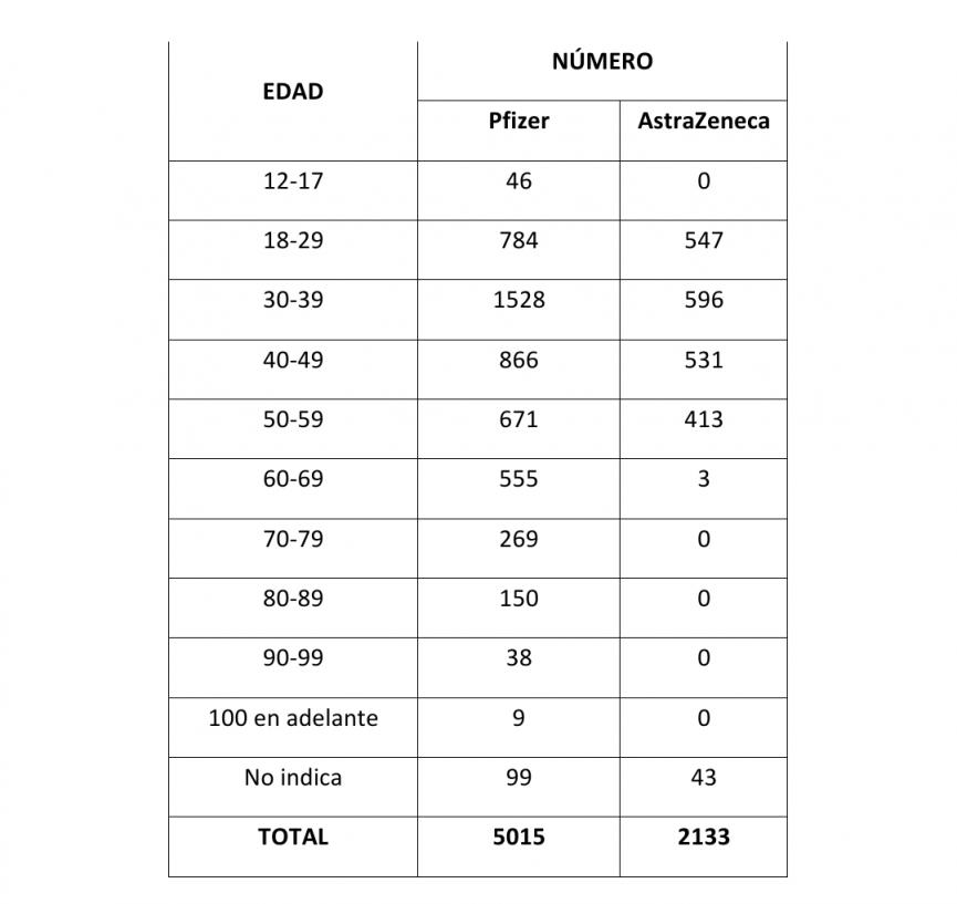 El Centro Nacional de Farmacovigilancia al 30 de julio de 2021 analizó un total de 5.015 notificaciones de ESAVI con la vacuna de Pfizer y 2.133 notificaciones de ESAVI con AstraZeneca. Dentro de las reacciones más reportadas con la vacuna de Pfizer se encuentran los trastornos del sistema nervioso (mayoritariamente la cefalea), seguidos de trastornos en el punto de aplicación (dolor local), de trastornos generales (fiebre/febrícula) así como trastornos de la piel (erupción cutánea / rash). Para la vacuna de AstraZeneca la cefalea también es la reacción más frecuente que se presenta, seguida de fiebre o febrícula, trastornos del sistema músculo esquelético (mialgias) y trastorno general (dolor).