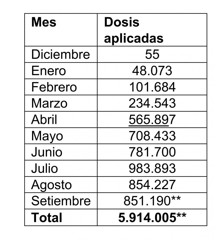Setiembre ya suma en 5 días un acumulado de 581.190 dosis, siendo el mes con mayor crecimiento y rapidez de recepción de vacunas. Ver cuadro detalle.